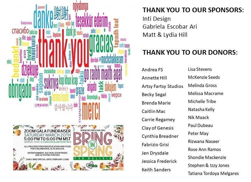Thank you to everyone who helped make our Bring in Spring for Bolivia event a success! The proceeds from this fundraiser will go to our nutrition and education support programs for the children in El Alto, Bolivia. Muchas Gracias!!